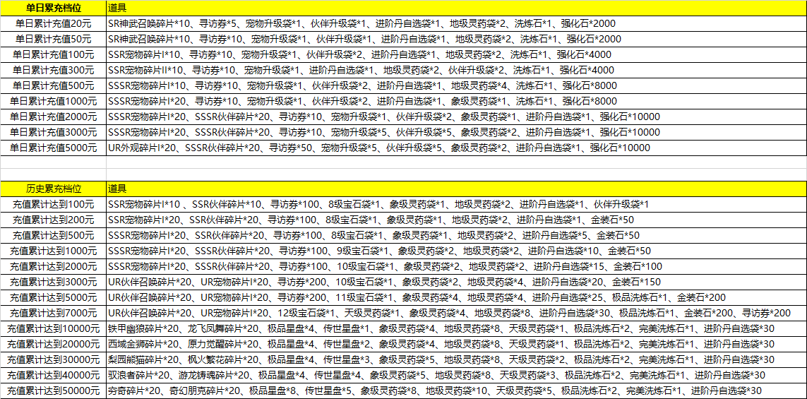 用户累计充值金额达到以上金额,可联系企业微信客服申请终身累充奖励,可获得对应金额礼包(每个礼包只能领取一次)